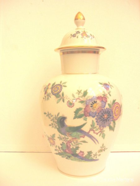 (ostasiatische/indische Malerei) Deckelvase: 22,5 cm hoch. Aufglasurmalerei auf Porzellan.